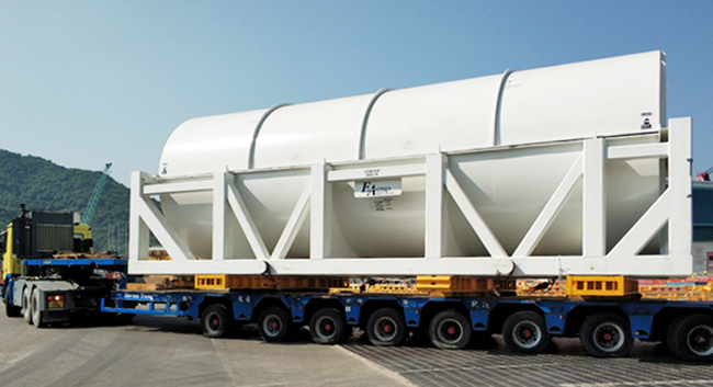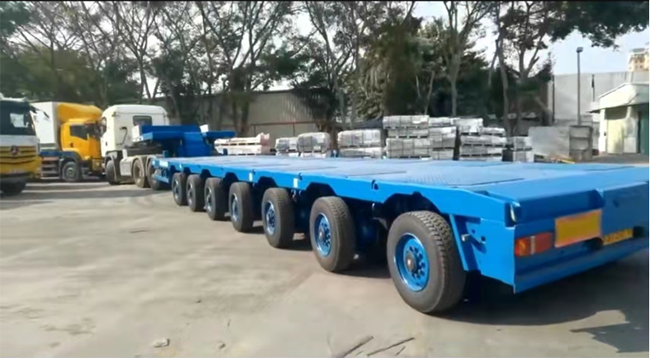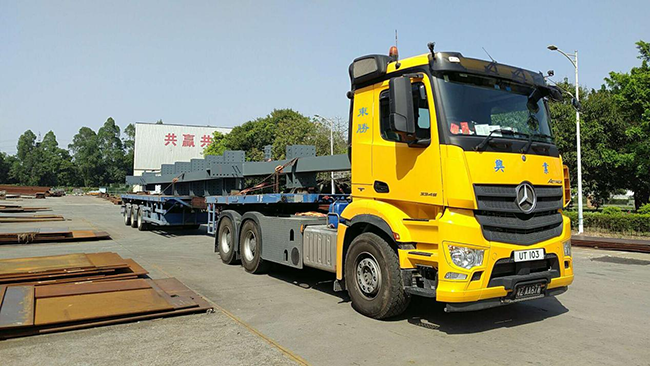東勝物流中港平板車普通板長12.米,寬2.4米,高1.3米 5軸可裝載25噸重量,6軸可裝載28噸。 主要針對超長、超大,超重機器設備等的運輸。